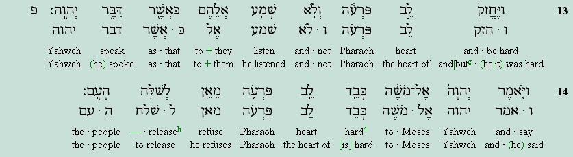 “The hardening of Pharaoh is ascribed to God, not only in the passages just quoted, but also in Ex. 9:12; 10:20, 27; 11:10; 14:8; that is to say, ten times in all; and that not merely as foreknown or foretold by Jehovah, but as caused and effected by Him. In the last five passages it is invariably stated that “Jehovah hardened (...) Pharaoh’s heart.” But it is also stated just as often, viz., ten times, that Pharaoh hardened his own heart, or made it heavy or firm; e.g., in Ex. 7:13, 22; 8:15; 9:35, ... “and Pharaoh’s heart was (or became) hard;” Ex. 7:14, ... “Pharaoh’s heart was heavy;” in Ex. 9:7, ...; in Ex. 8:11, 28; 9:34, ... or ...; in Ex. 13:15, ... “for Pharaoh made his heart hard.” According to this, the hardening of Pharaoh was quite as much his own act as the decree of God. But if, in order to determine the precise relation of the divine to the human causality, we look more carefully at the two classes of expressions, we shall find that not only in connection with the first sign, by which Moses and Aaron were to show their credentials as the messengers of Jehovah, sent with the demand that he would let the people of Israel go (Ex. 7:13, 14), but after the first five penal miracles, the hardening is invariably represented as his own. After every one of these miracles, it is stated that Pharaoh’s heart was firm, or dull, i.e., insensible to the voice of God, and unaffected by the miracles performed before his eyes, and the judgments of God suspended over him and his kingdom, and he did not listen to them (to Moses and Aaron with their demand), or let the people go (Ex. 7:22; 8:8, 15, 28; 9:7). It is not till after the sixth plague that it is stated that Jehovah made the heart of Pharaoh firm (Ex. 9:12). At the seventh the statement is repeated, that “Pharaoh made his heart heavy” (Ex. 9:34, 35); but the continued refusal on the part of Pharaoh after the eighth and ninth (Ex. 10:20, 27) and his resolution to follow the Israelites and bring them back again, are attributed to the hardening of his heart by Jehovah (Ex. 14:8, cf. vv. 4 and 17). This hardening of his own heart was manifested first of all in the fact, that he paid no attention to the demand of Jehovah addressed to him through Moses, and would not let Israel go; and that not only at the commencement, so long as the Egyptian magicians imitated the signs performed by Moses and Aaron (though at the very first sign the rods of the magicians, when turned into serpents, were swallowed by Aaron’s, 7:12, 13), but even when the magicians themselves acknowledged, “This is the finger of God” (Ex. 8:19). It was also continued after the fourth and fifth plagues, when a distinction was made between the Egyptians and the Israelites, and the latter were exempted from the plagues,—a fact of which the king took care to convince himself (Ex. 9:7). And it was exhibited still further in his breaking his promise, that he would let Israel go if Moses and Aaron would obtain from Jehovah the removal of the plague, and in the fact, that even after he had been obliged to confess, “I have sinned, Jehovah is the righteous one, I and my people are unrighteous” (Ex. 9:27), he sinned again, as soon as breathing-time was given him, and would not let the people go (Ex. 9:34, 35). Thus Pharaoh would not bend his self-will to the will of God, even after he had discerned the finger of God and the omnipotence of Jehovah in the plagues suspended over him and his nation; he would not withdraw his haughty refusal, notwithstanding the fact that he was obliged to acknowledge that it was sin against Jehovah. Looked at from this side, the hardening was a fruit of sin, a consequence of that self-will, high-mindedness, and pride which flow from sin, and a continuous and ever increasing abuse of that freedom of the will which is innate in man, and which involves the possibility of obstinate resistance to the word and chastisement of God even until death. As the freedom of the will has its fixed limits in the unconditional dependence of the creature upon the Creator, so the sinner may resist the will of God as long as he lives. But such resistance plunges him into destruction, and is followed inevitably by death and damnation. God never allows any man to scoff at Him. Whoever will not suffer himself to be led, by the kindness and earnestness of the divine admonitions, to repentance and humble submission to the will of God, must inevitably perish, and by his destruction subserve the glory of God, and the manifestation of the holiness, righteousness, and omnipotence of Jehovah.” [Keil, C. F., & Delitzsch, F. (1996). Commentary on the Old Testament (Vol. 1, pp. 294–295). Peabody, MA: Hendrickson.]